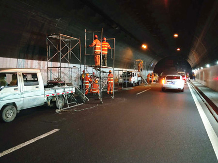 圖為隧道內(nèi)舊燈具拆除現(xiàn)場(chǎng)