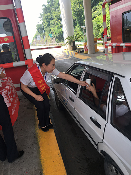 圖為工作人員合影 活動當天,該所在車道安全島內搭起臨時“便民服務臺”,不僅免費為司乘人員提供綠豆湯、礦泉水等消暑食品,還備足藿香正氣水、風油精、清涼油、花露水等解暑降溫藥品。活動中,大家身披橫幅,面帶微笑,向途經收費所的司機遞上一杯杯綠豆湯、一瓶瓶礦泉水。同時,大家還不忘宣傳行車安全注意事項,提醒司機朋友在高溫酷暑時節多注意安全。司機朋友們不時露出欣喜的笑容,連連稱謝。 臨海南收費所通過開展“夏日送清涼”活動,不僅給廣大司乘人員在酷暑中送去絲絲涼意和關心,更加促進了收費員與司乘人員之間的溝通交流,拉近距離,從而贏得了過往司乘人員的好評,塑造了良好的窗口形象。 陳瑩