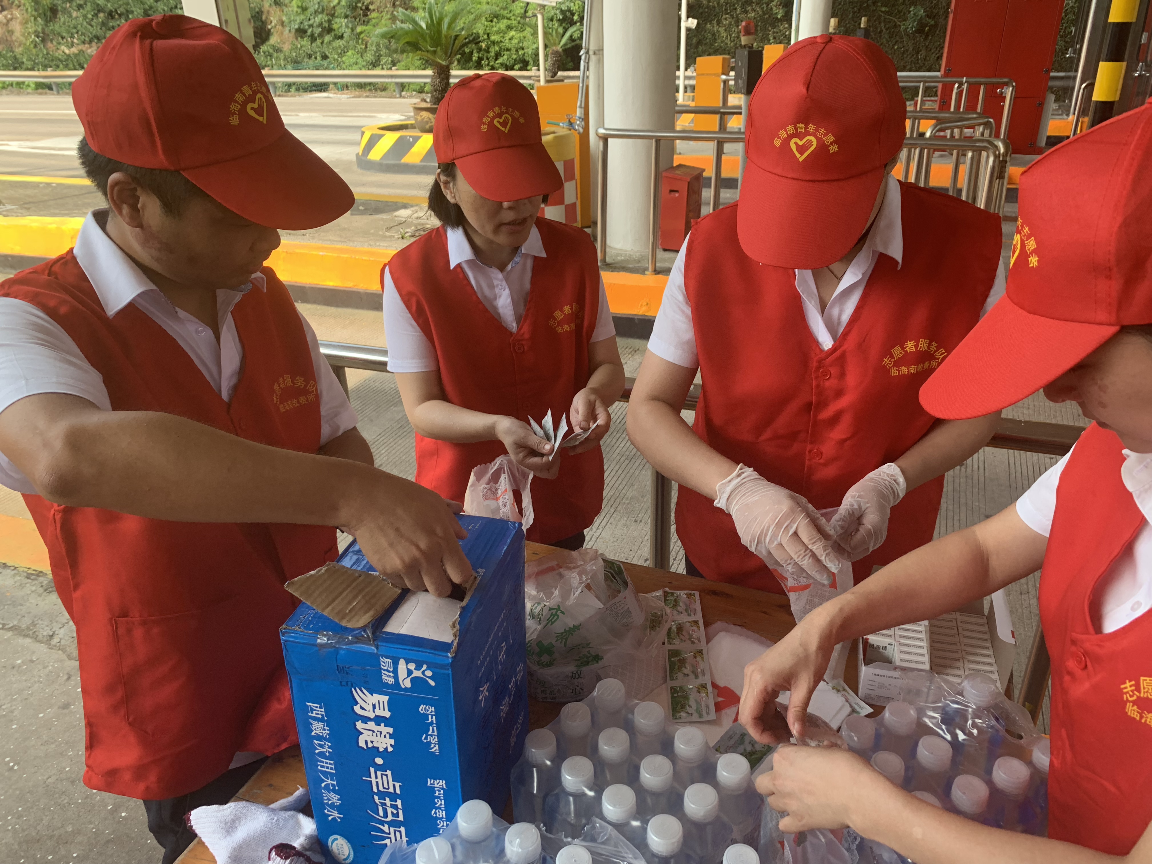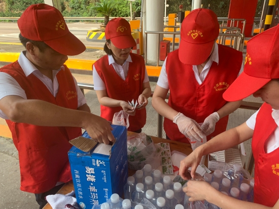 圖為志愿者在準備防暑物品 “師傅,辛苦啦!這袋子里有礦泉水、風油精、人丹一些防暑物品,您拿好,路上帶著以備不時之需!” “沒想到,你們收費站還有這個服務,這次我要出趟遠門,說不定路上還真能用的上,謝謝呀!”一位接過禮品袋的老師傅連聲道謝。