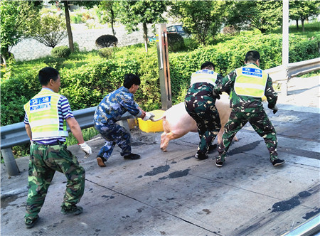面對(duì)突發(fā)的緊急情況,駕駛員一時(shí)束手無(wú)策,當(dāng)班副班長(zhǎng)立即向值班領(lǐng)導(dǎo)匯報(bào),請(qǐng)求增援。為了防止這頭豬給過(guò)往車輛造成安全通行威脅,收費(fèi)所工作人員及時(shí)關(guān)閉了7號(hào)車道,此時(shí)的“二師兄”不讓人靠近,大家只好形成一個(gè)包圍圈,不讓它竄到其他車道去。幾分鐘后,增援的高速執(zhí)勤隊(duì)員趕到現(xiàn)場(chǎng),大家七手八腳,終于將這頭豬扛著,送回到了小貨車上。執(zhí)勤隊(duì)員說(shuō),這輛車上的一頭豬剛剛還在黃土嶺隧道內(nèi)跳出來(lái)一次。