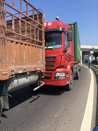 上圖為事故車輛 當天中午,在副站崗亭旁站的工作人員發現該所前方出口不遠處有貨車停在那里不動,以致后面車輛無法通行。工作人員隨即跑到前方查看情況,原來是三輛貨車發生追尾,其中有一輛車車頭被撞得凹陷,擋風玻璃也被撞碎,在了解事故現場無人員受傷后,工作人員馬上向監控中心匯報情況。由于事故車輛較大面積滯留,導致后方車子堵到主線上,一些不明情況的駕駛員在車里使勁按喇叭催促,現場充滿焦躁情緒。 如何盡快疏通道路?正在食堂吃飯的一班班長潘慶耀放下碗筷跑到事故現場,同工作人員叫前面受損較少的事故車輛先把車子開出收費站,再讓第三輛受損嚴重的車子試著發動車子開出去,所幸三輛車子都能開離車道。在將地上的破損碎片清理到車道兩旁后,工作人員繼續指揮車輛向前行駛,收費內廣場在較短時間內恢復了正常通行。 沈芬芳