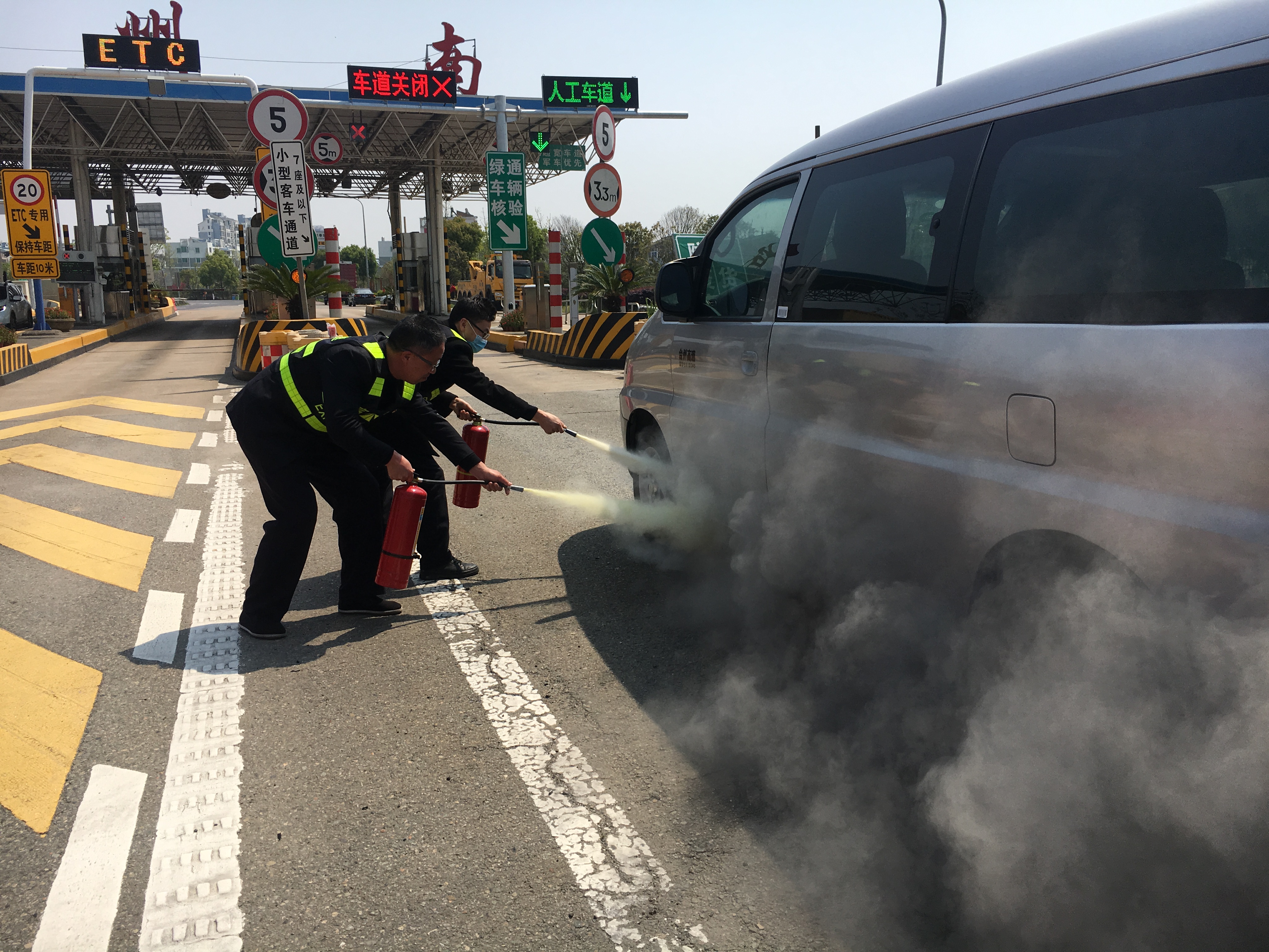 圖為交通事故應急演練 在收費廣場交通事故應急預案演練中,該所模擬了汽車在收費車道起火的交通事故。事故發(fā)生后,當班班長第一時間啟動預案,將險情報告監(jiān)控員,并立即關(guān)閉事故車道,組織人員對起火點進行前期壓制,同時指揮人員擺放標志,引導后續(xù)車輛,并快速放行。接到險情報告的所長、辦公室人員迅速趕到現(xiàn)場參與救援:女同志協(xié)助班組開足車道;部分男同志負責出入口車輛的疏導指揮工作;其余人員負責對火災進行撲滅……大家各司其職,快速處理險情。