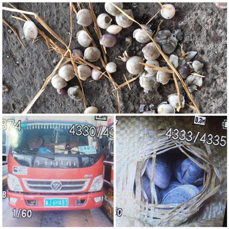 11月2日上午10:39分左右,車牌為浙J6HA83的小貨車駛?cè)霚貛X西收費所2號崗?fù)ぃ撥囻{駛員稱自己運載的貨物為綠農(nóng)產(chǎn)品,要求免費,堵塞車道一個多小時。最后在取證報警下,駕駛員交付通行費320元。 該車被篷布包著,車上貨物又被袋子緊緊包著。當(dāng)工作人員要求檢查取證時,駕駛員只摳開指定的袋子,并且口子開得非常小,只讓人隱約看到貨物是貝殼。工作人員按規(guī)定要求駕駛員打開另一處取證,駕駛員以貨物被繩子綁著不好打開為由,只在前端把袋子摳了一個比硬幣大點的小洞,拿出幾個貝殼,工作人員看到其拿出的貝殼不管是在大小還是顏色上,都和他剛才指定的那袋貨物有明顯區(qū)別,于是工作人員親自用手摸進去查驗,經(jīng)仔細檢查,貨物屬于貝殼中的殘次品,懷疑是飼料用途。