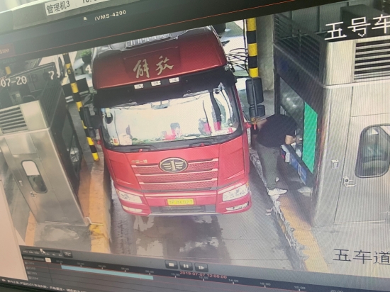 圖為失主遺落錢(qián)財(cái)現(xiàn)場(chǎng) 當(dāng)天上午,收費(fèi)班長(zhǎng)李寧巡查時(shí)在第五車(chē)道窗口附近發(fā)現(xiàn)了三百元現(xiàn)金,經(jīng)多方確定不是所內(nèi)工作人員遺失后,判斷為過(guò)往司機(jī)不小心遺失。為了盡快找到失主,李寧隨即去監(jiān)控室調(diào)取視頻查找。 經(jīng)過(guò)監(jiān)控查找,馬上鎖定了一輛車(chē)牌為“豫”字開(kāi)頭的大貨車(chē)。原來(lái)當(dāng)時(shí)因駕駛室距離窗口較遠(yuǎn),司機(jī)下車(chē)付錢(qián),監(jiān)控中清晰顯示司機(jī)在掏錢(qián)繳費(fèi)時(shí)三百塊現(xiàn)金從口袋里掉到車(chē)道上,但是司機(jī)因?yàn)橼s路絲毫沒(méi)有發(fā)覺(jué)。確認(rèn)失主后,工作人員查詢司機(jī)電話并取得聯(lián)系,告知其遺失三百現(xiàn)金,在通過(guò)微信確認(rèn)身份后,李寧將錢(qián)轉(zhuǎn)給了司機(jī)。