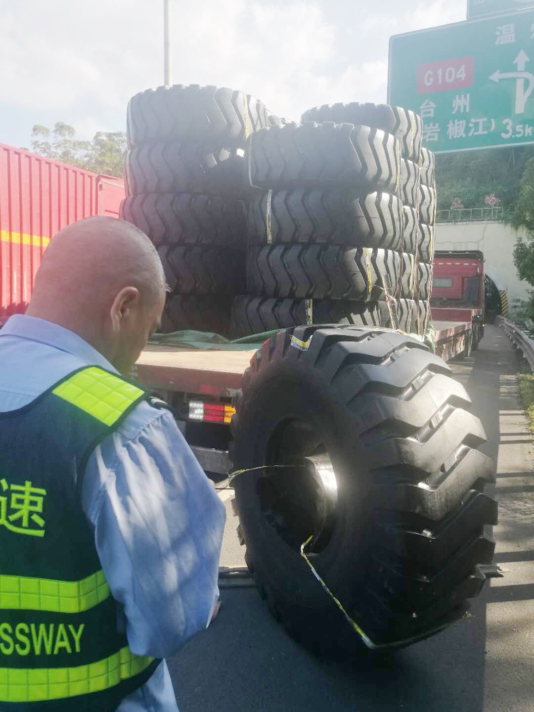 執(zhí)勤隊接警后立即趕往事故地點,一輛運載輪胎的貨車??吭谥鬈嚨?,其中一個巨型輪胎滑落到硬路肩上,致使后方車輛紛紛避讓。為及時消除險情,執(zhí)勤隊快速在現(xiàn)場做好安全警戒工作,同時將現(xiàn)場情況反饋給監(jiān)控中心。由于貨車綁繩索松動,重達300多斤的輪胎脫落在地,隨后執(zhí)勤隊協(xié)同施救中心、駕駛?cè)?/span>員合力將掉落的輪胎先拖至車旁,經(jīng)過長達半個小時的搶險,跌落的貨物終于完好無缺地回到貨車上,道路恢復(fù)暢通。 筆者溫馨提醒:在高速公路行駛過程中,駕駛?cè)藨?yīng)注意將車上的貨物固定好,途中要隨時注意貨物及捆綁繩索是否松動。無論是車輛撒落物還是人為拋灑物,都會給道路安全暢通埋下了重大隱患! 林玲