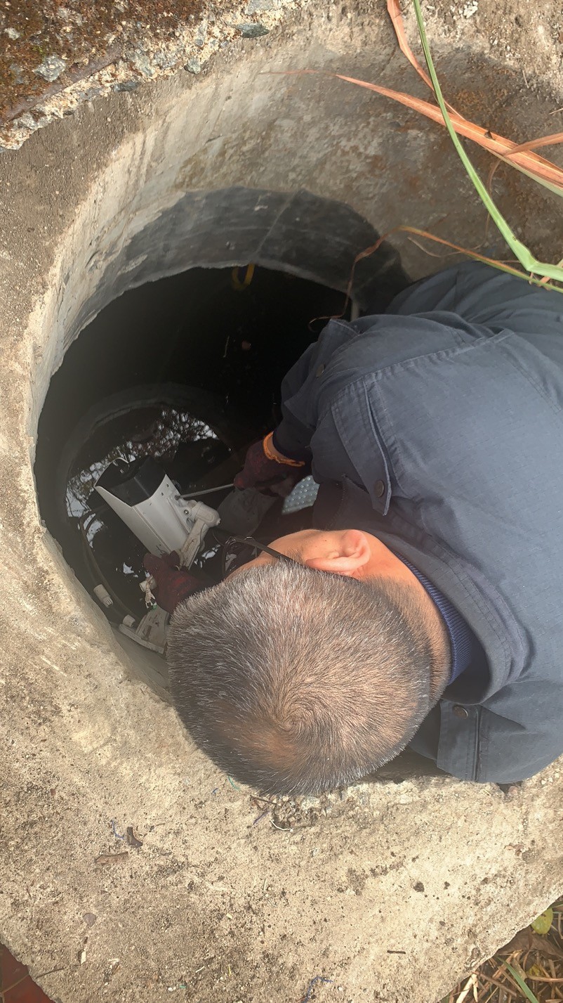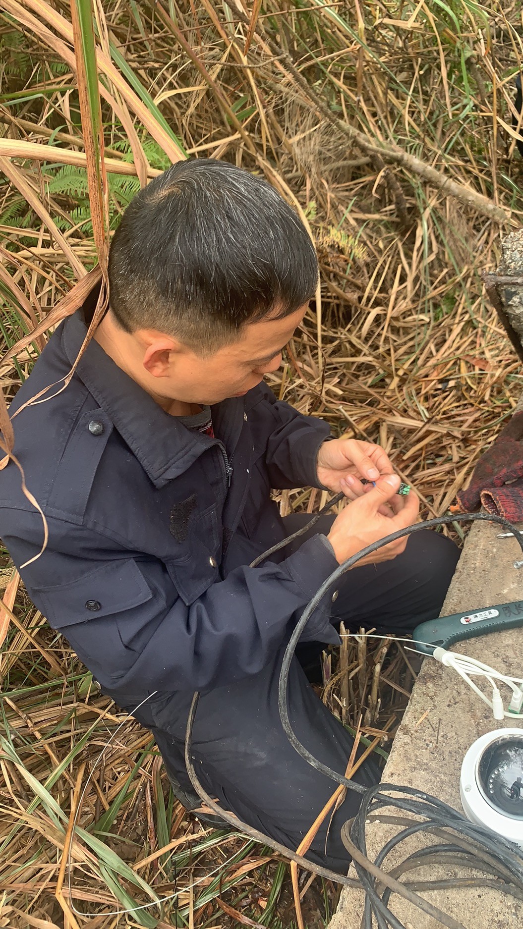 大溪嶺南高位水池地點(diǎn)在溫州地界,山體較高,攀行需要近一個(gè)小時(shí),金所得知情況后,立即帶著執(zhí)勤隊(duì)上山到高位水池檢查,他們背著工具箱,戴著手套、拿著柴刀,經(jīng)過一個(gè)小時(shí)的披荊斬棘來到南高位水池的井口,金所爬到井里進(jìn)行檢查,發(fā)現(xiàn)光纜和電線都被老鼠咬斷了,才導(dǎo)致圖像不能工作,當(dāng)場(chǎng)把電線接了回去,并回所準(zhǔn)備其他材料,明日再次登山修理。