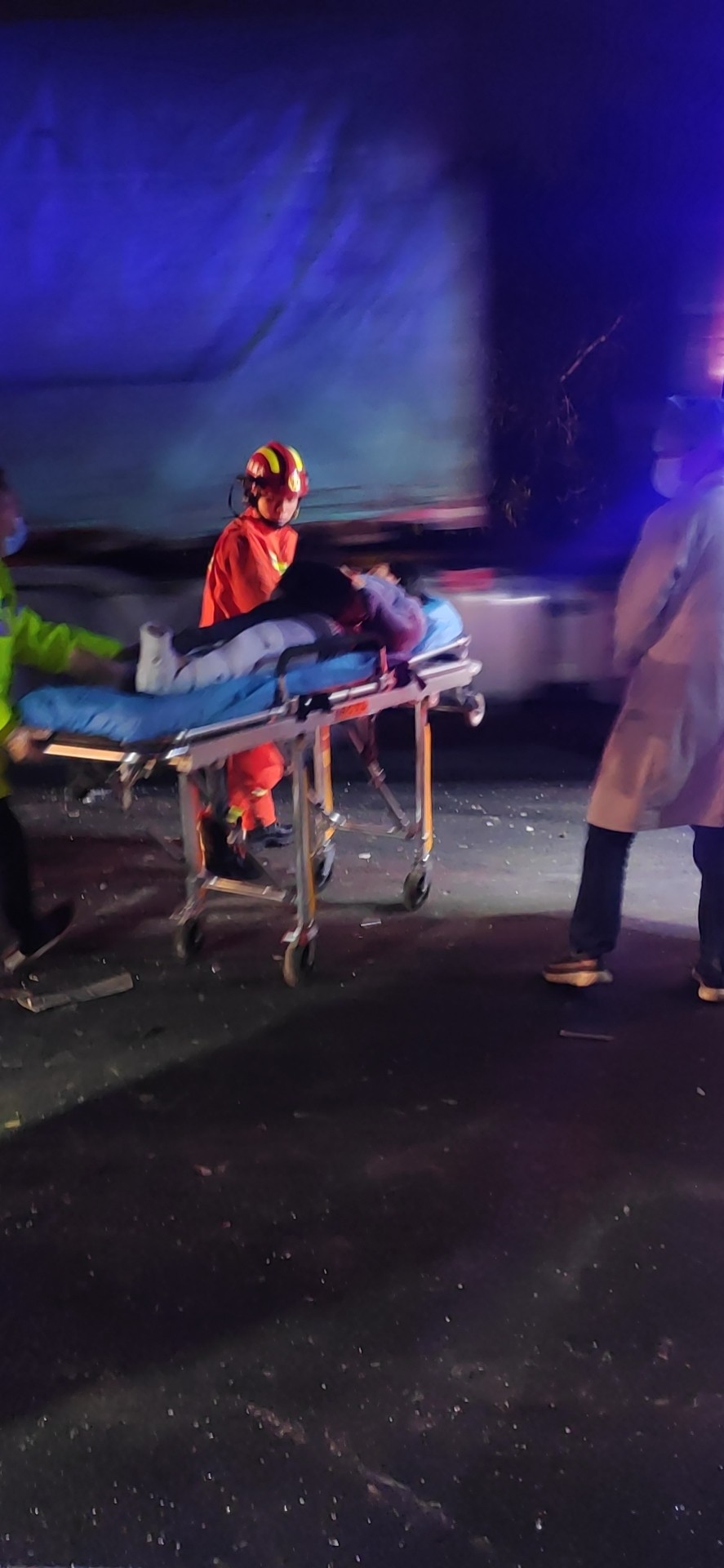 21:50巡邏車和消防車同時到達(dá)現(xiàn)場,隊員陳幸飛快的跑下來,以百米沖刺的速度做好巡邏車的安全措施和預(yù)警工作,有3人受傷,事故車頭已嚴(yán)重變形,一名女性腰部受傷坐在地上,語速正常,思維清晰。還有二名人員被卡在駕駛室,消防隊員正在查看現(xiàn)場準(zhǔn)備施救,受傷人員哭爹喊娘嚎聲不斷,由于救護車還沒達(dá)到現(xiàn)場,陳幸在事故車后方硬路肩上維護秩序,防止車輛占道,并同時迎接救護車,湯寧光則在維護現(xiàn)場秩序,阻止其他司機圍觀影響救援。 22:00第一輛救護車到達(dá)。醫(yī)護人員準(zhǔn)備擔(dān)架,另一名醫(yī)生去詢問坐在地上的受傷人員,由于車頭嚴(yán)重變形,司機與鄰座的人都被卡在駕駛室,經(jīng)過消防員的救援,受傷最嚴(yán)重的司機首先被救了下來,在被救下的那刻暈了過去,醫(yī)護人員立該把傷員抬上救護車,緊接著消防員救下第二位被卡傷員,第二輛救護車帶著傷員離開,最后一輛救護車卻遲遲沒到,經(jīng)聯(lián)系監(jiān)控中心后得知救護車已上高速,但因后方車輛太多,救護車和拖車都被堵了,經(jīng)和臺州高速交警協(xié)商后,最后清理一個車道讓救護車和拖車先開上來,巡邏車去事故車后方預(yù)警,22:30救護車帶走最后一名傷員,事故車被拖走,路面恢復(fù)正常通車。