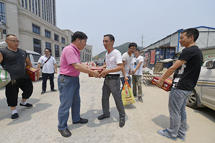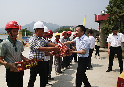 圖為公司副董事長、總經(jīng)理張建平給內(nèi)環(huán)路一線人員送上消暑慰問品