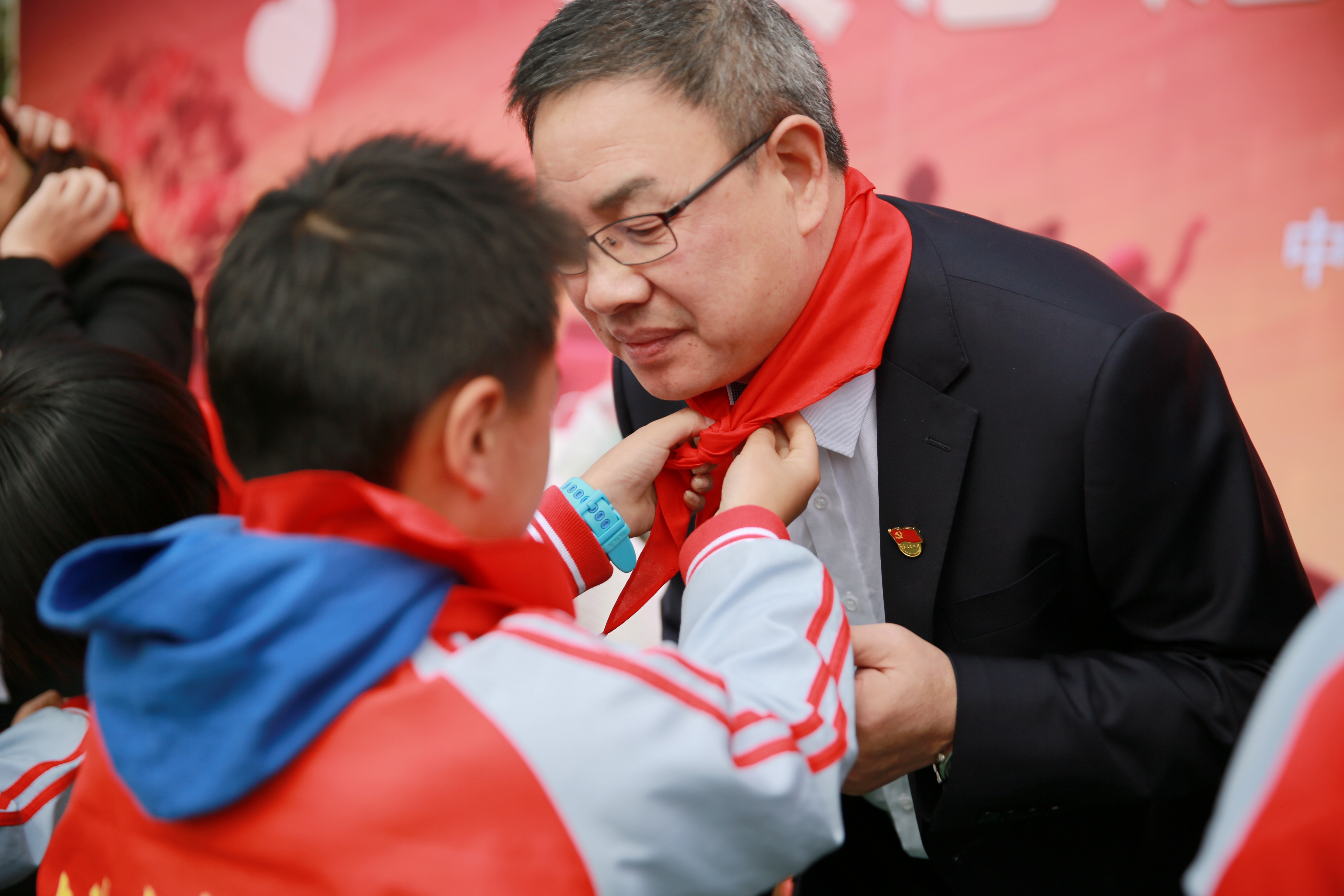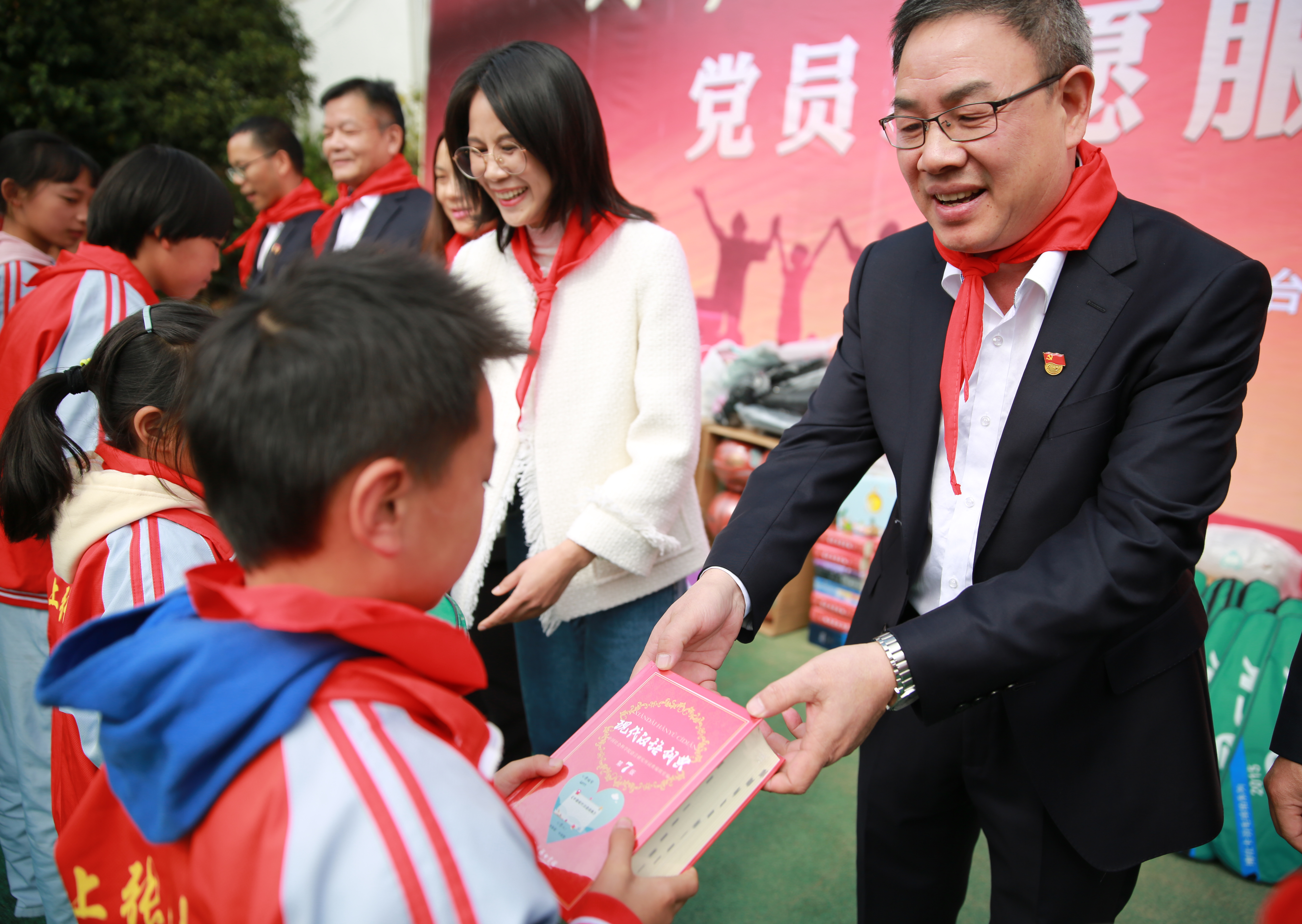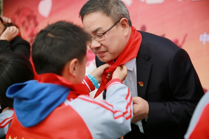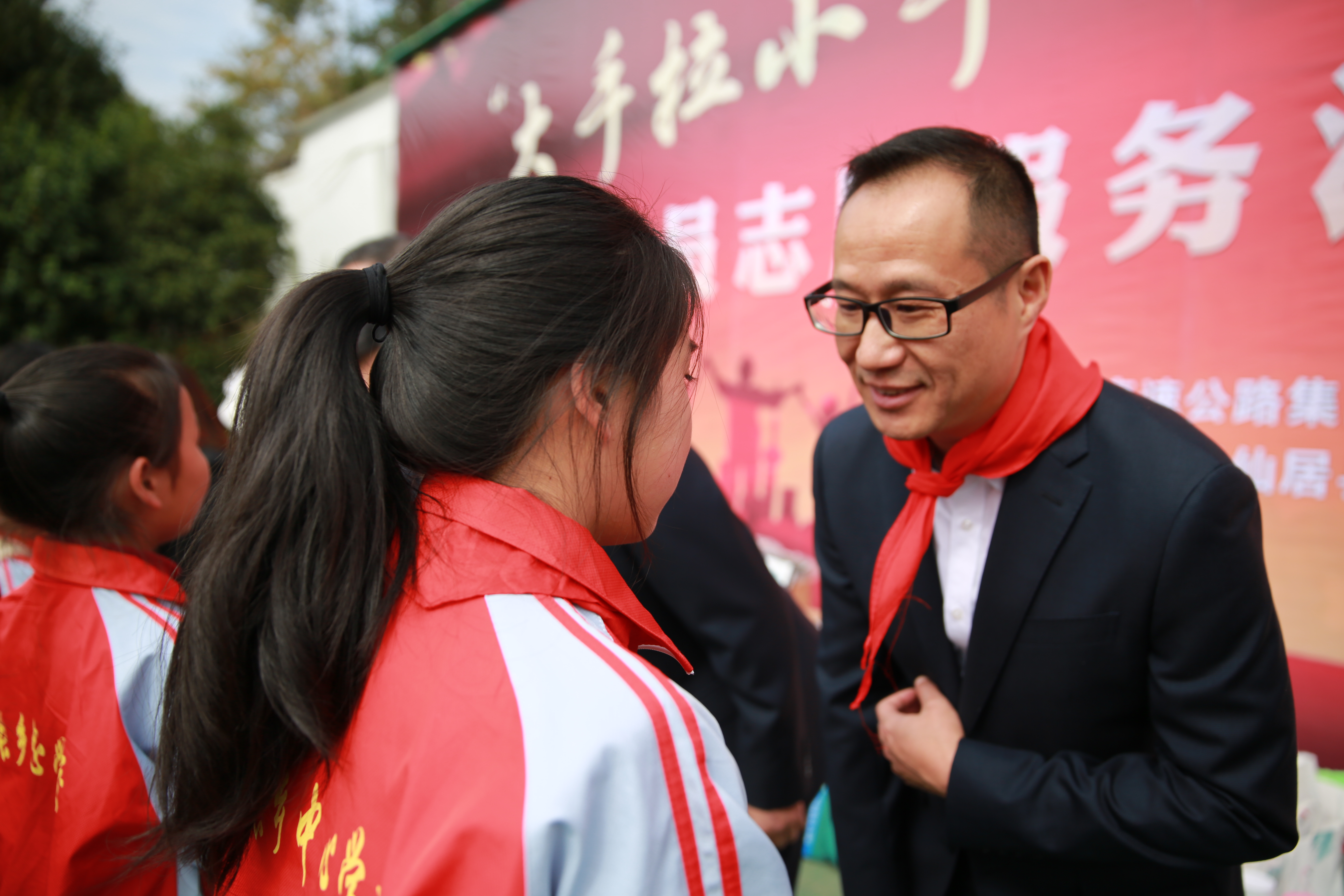 在“點(diǎn)亮微心愿”環(huán)節(jié),臺(tái)州高速集團(tuán)領(lǐng)導(dǎo)班子們?yōu)?/span>學(xué)生代表送上新衣服、學(xué)習(xí)用品等,孩子們則為志愿者叔叔阿姨們系上了在他們眼中最珍貴的紅領(lǐng)巾。