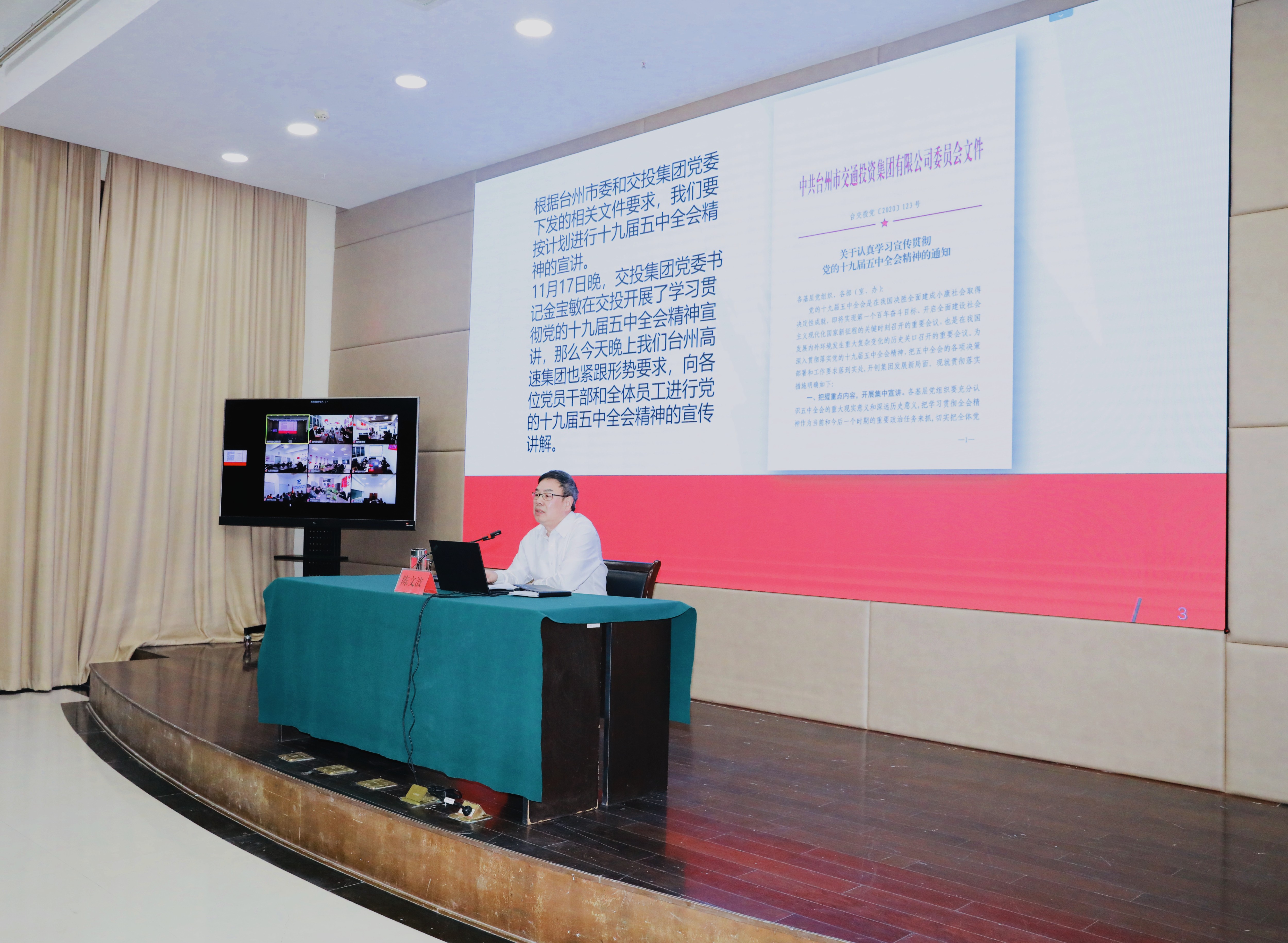 11月23日晚,臺(tái)州高速集團(tuán)黨委書記、董事長(zhǎng)、總經(jīng)理陳文波在集團(tuán)大樓會(huì)議室作黨的十九屆五中全會(huì)精神宣講報(bào)告。集團(tuán)領(lǐng)導(dǎo)班子成員,各支部書記,大樓全體員工現(xiàn)場(chǎng)參加學(xué)習(xí),各所、中心、子公司通過視頻會(huì)議系統(tǒng)同步學(xué)習(xí)。