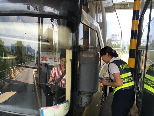 在臺(tái)州南收費(fèi)所車道里,收費(fèi)班長辛舟飛正細(xì)致耐心地向客車司機(jī)進(jìn)行政策宣傳和解釋。