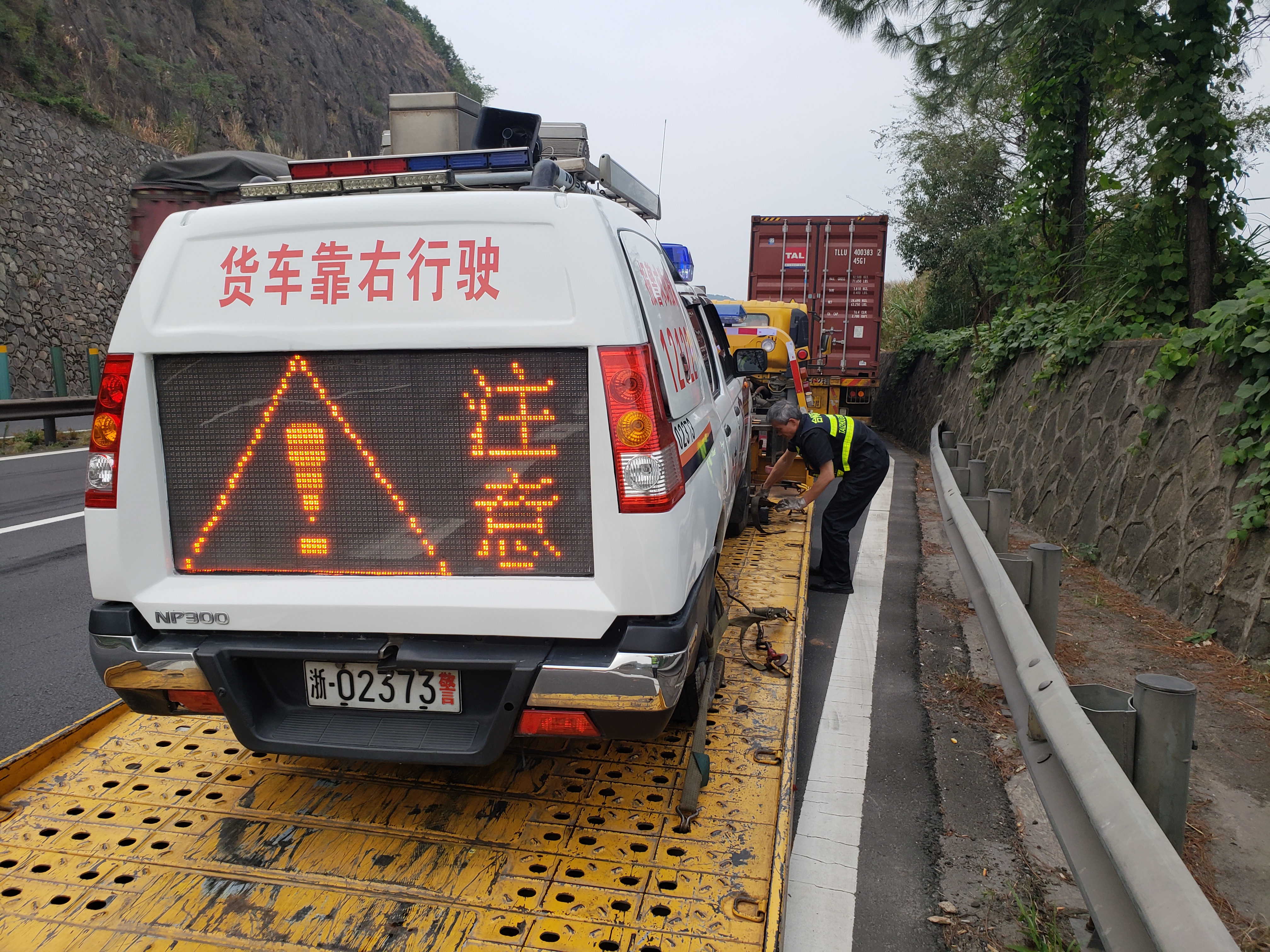 25日上午10點,兩人處理一輛沒有年檢已經達到報廢標準的小面包車時,接到指揮中心報警,一輛奧迪小轎車拋錨在臺州收費站往臺州南方向出匝道位置的超車道上,需要救援。