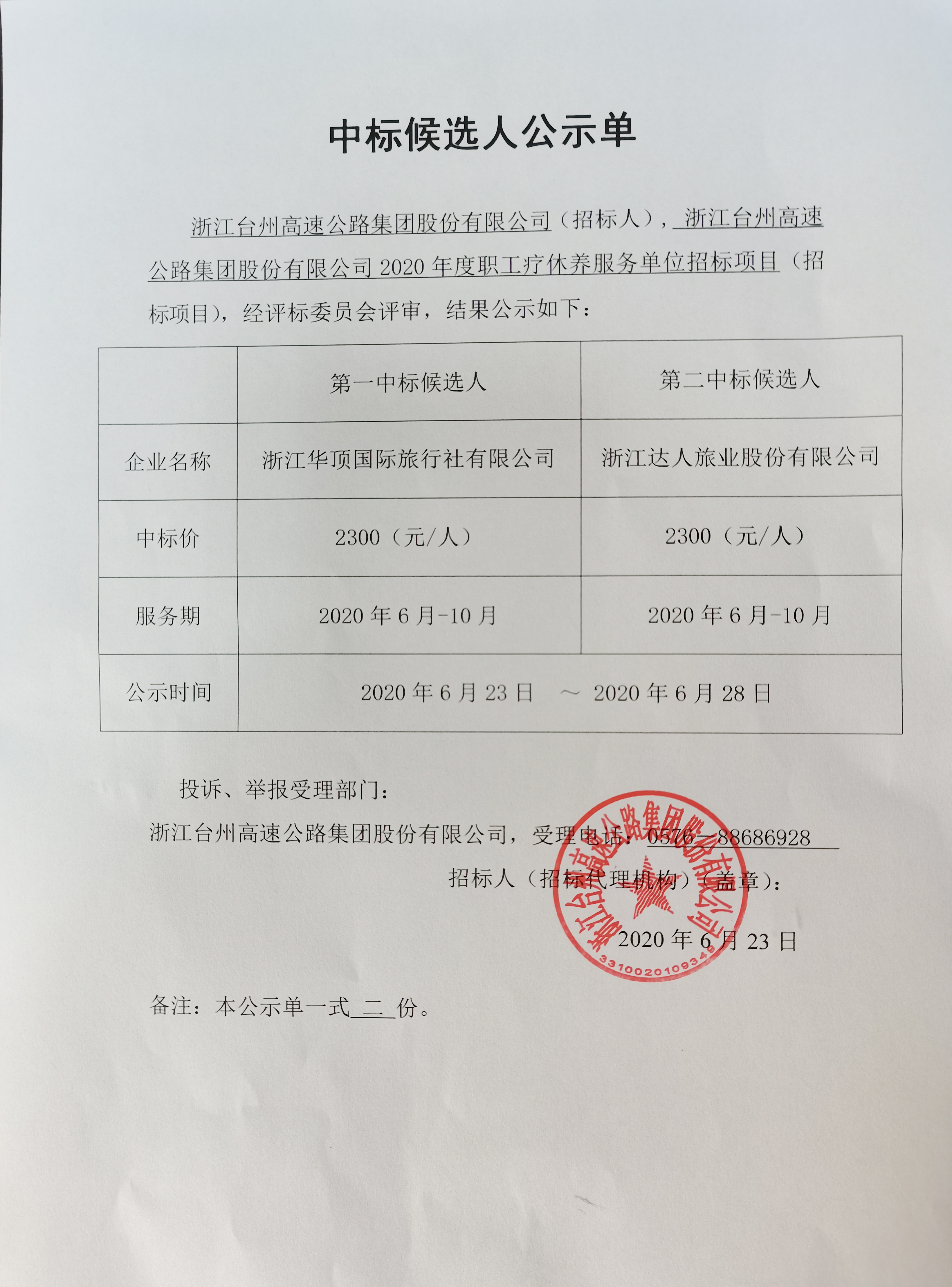 2020年度職工療休養服務單位招標項目中標候選人公示單