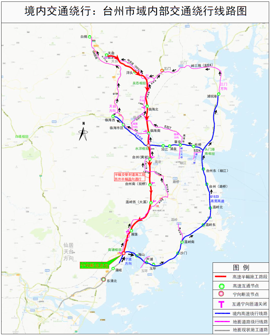 屆時雁蕩、溫嶺西(大溪)、臺州南(院橋)、臺州(黃巖)寧波方向關閉14天,臨海南、臨海北互通寧波方向進口關閉7天,洋頭互通上虞方向進口關閉7天,所有車輛禁止上高速;溫州方向進出口將根據改道需要臨時關閉。