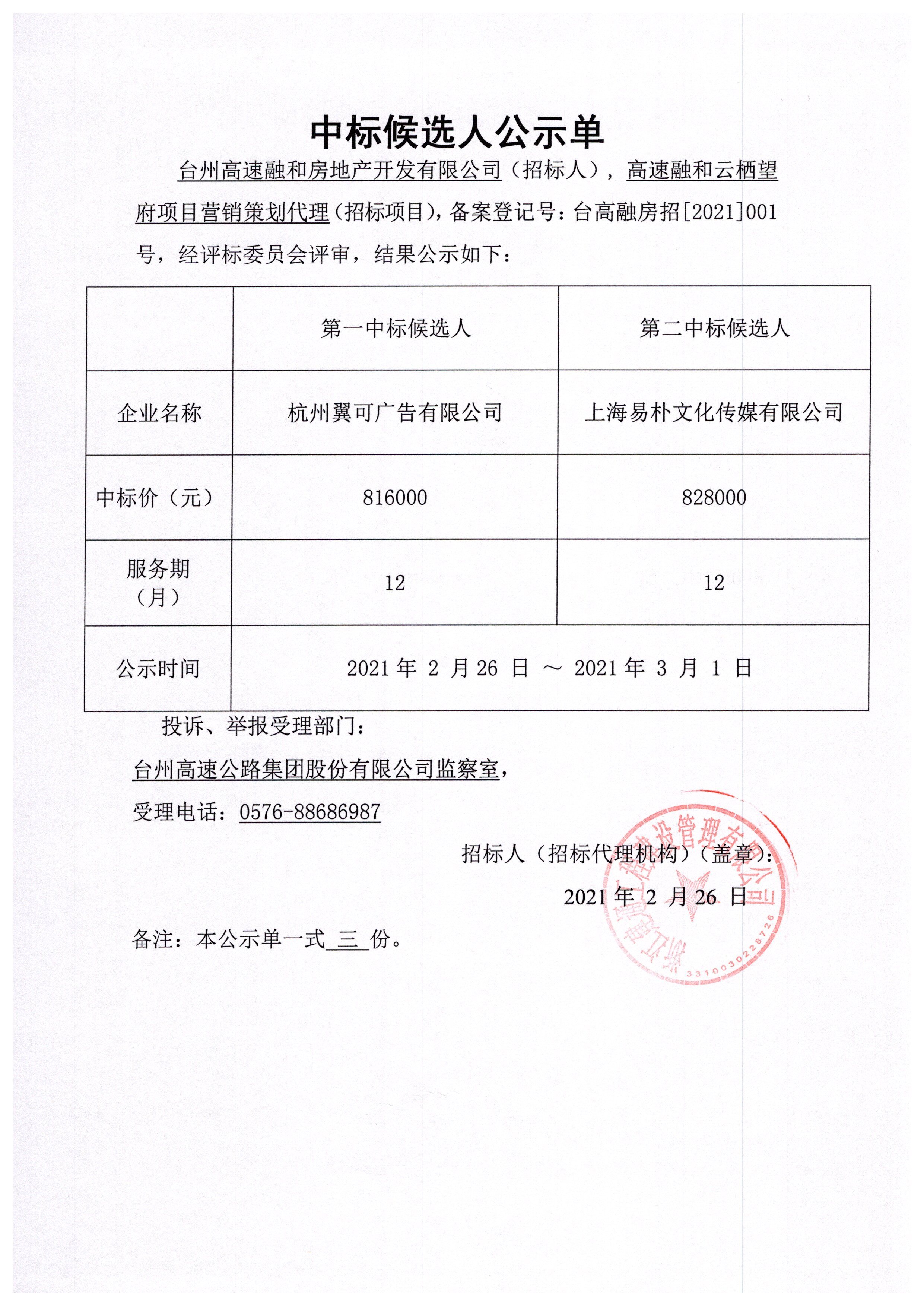 高速融和云棲望府項(xiàng)目營銷策劃代理中標(biāo)候選人公示