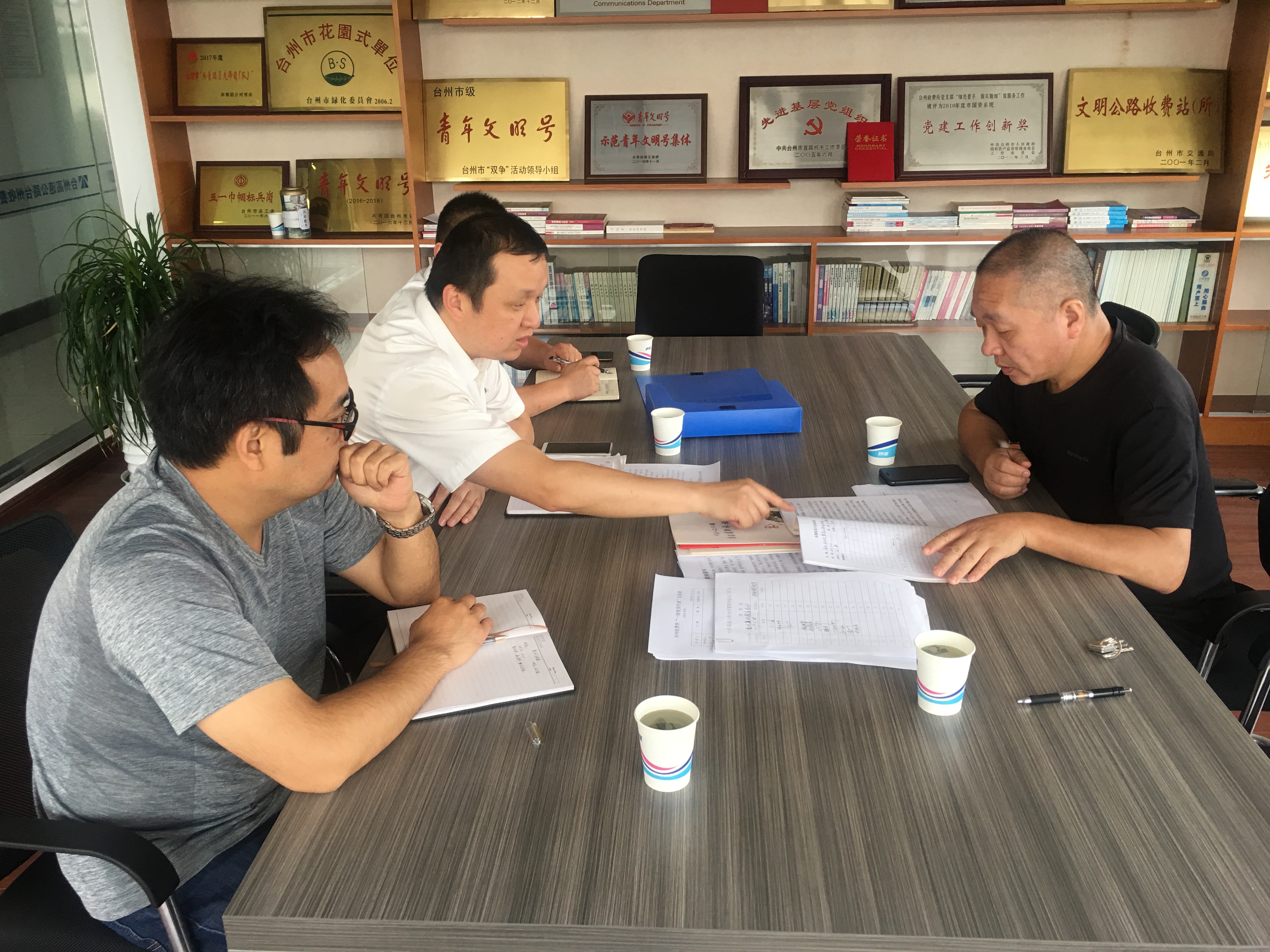 圖為檢查組在臺(tái)州收費(fèi)所檢查 本次檢查以年初簽訂的《黨風(fēng)廉政建設(shè)責(zé)任書》和新出臺(tái)的《集團(tuán)公司黨風(fēng)廉政建設(shè)責(zé)任制檢查考核辦法》為依據(jù),以廉政教育開(kāi)展頻率及支部書記上廉政黨課完成情況為重點(diǎn),通過(guò)聽(tīng)取責(zé)任人工作情況介紹、翻閱相關(guān)工作臺(tái)帳資料等形式,查證黨風(fēng)廉政建設(shè)責(zé)任實(shí)際落實(shí)情況。