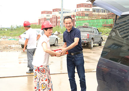 圖為仁和房產(chǎn)董事長(zhǎng)羅小將向施工單位代表遞送慰問品